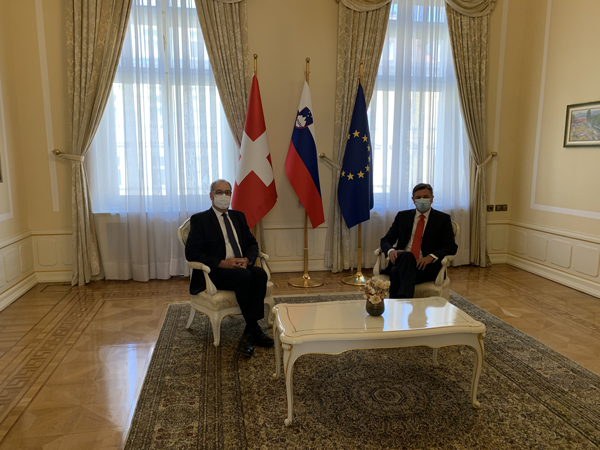 Bundespräsident Guy Parmelin ist bei seinem Besuch in Slowenien am Mittwoch, 9. Juni 2021, mit Präsident Borut Pahor zusammengekommen. Ausserdem führte der Bundespräsident Gespräche mit Premierminister Janez Janša, Wirtschafts- und Technologieminister Zdravko Počivalšek und Parlamentspräsident Igor Zorčič.
